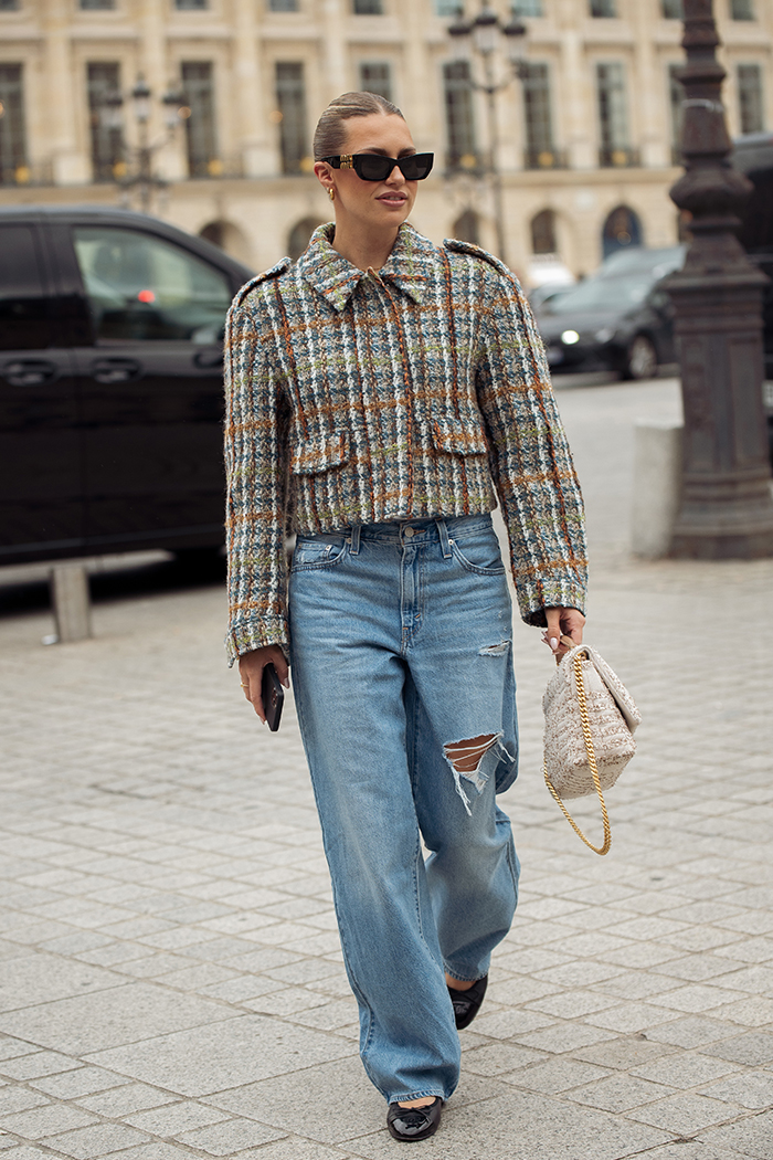 Nothing says cool like cropped. Sport a short tweed jacket over your favorite pair of jeans to fancy-up your everyday work OOTD. Add a classic purse and pair of sunnies to complete the look.