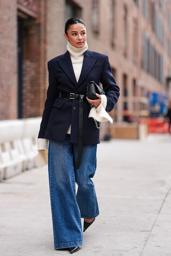 No power ‘fit is complete without the perfectly tailored bottom. Wear your pointiest heel with a wide-legged jeans to give total model-off-duty vibes. Finish off the look with a thick belted coat over a chunky turtle neck and serve chic from head-to-toe.