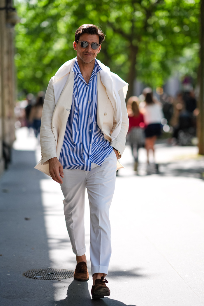 Our vacay motto for him includes lots of linens, a pop of color, and light layers to transition any outfit from the beach to the dinner reservations. One of our favorite pieces to bring? The classic blue and white striped button down.