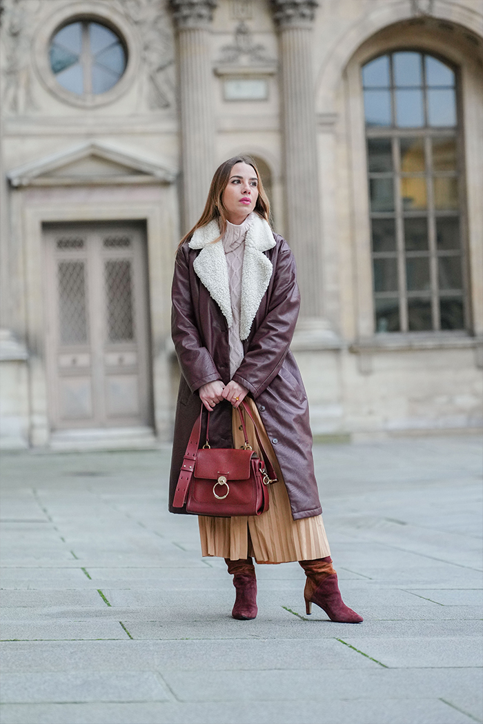 Heading home for the holidays? A long coat packed with a fluffy interior is the must-have piece for winter travel. Pair it with a long skirt and a heeled bootie for suitcase-ready style.