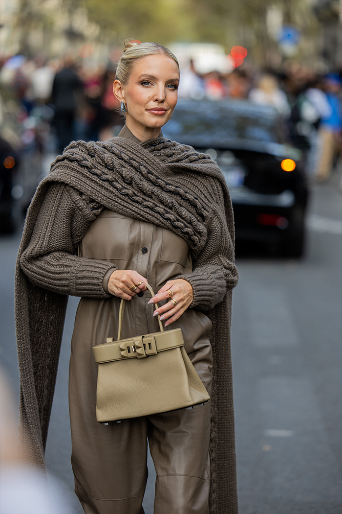 Brown doesn’t have to be boring. Pair a thick leather jacket over a dainty cardigan and lightweight skirt for loads of contrast and a play on texture.