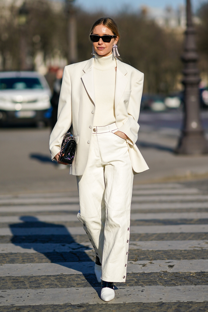 An all-white get-up for your 9-to-5 is what you closet didn’t know it was missing. Pair a fitted jacket with some wide leg pants, and break-up the color palette with a contrasting bag and shoes.