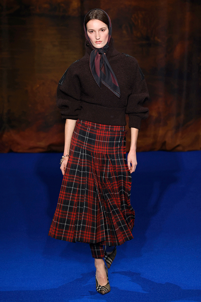Switch up the classic country club look with a chunky sweater over a patterned skirt. Add a silk head scarf to give a high-fashion final touch to your look.