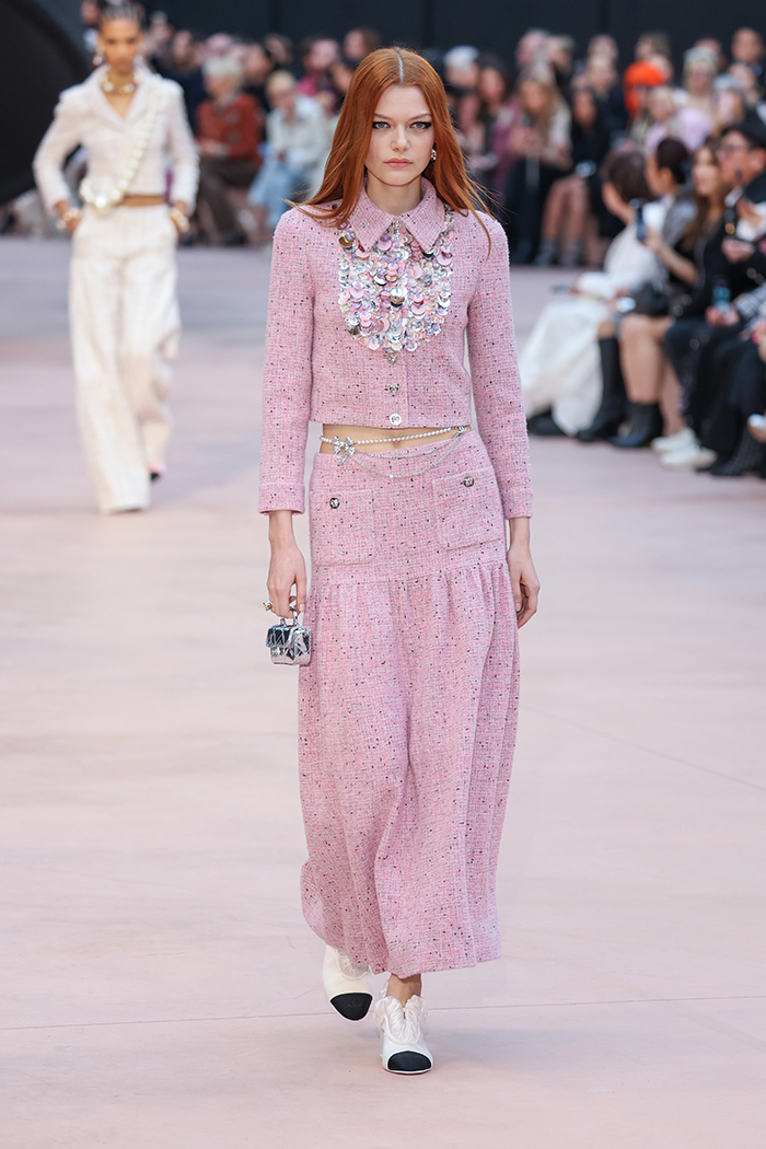Put a sparkly spin on tweed with a pink two-piece set and lots of glam. Spice up the classic polished aesthetic with this trendy high-end look.